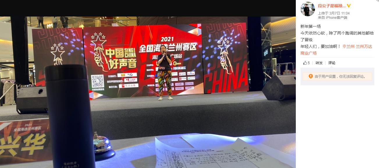 ![]() 段兴华在甘肃兰州音乐圈还是非常有名气的,在今年3月份,还被《新歌声请指教》聘请为兰州地区的评委,下面是聘任证书: ![]() 下面是他在微博上分享自己做评委的经历,看得出来他是一个非常善良的评委。他的微博地址是:https://weibo.com/p/1005051760042497 ![]() |