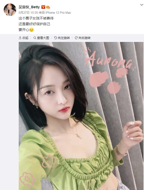 最近吴宣仪在微博上发了一条微博引起了网友一边倒的批评,微博内容是:“这个圈子女孩不被善待,还是要好好保护自己,要开心”,对于这条内容有的网友说吴宣仪穿搭的很土,有的说她矫情一手好牌打的稀巴烂,更多的网友是希望她能少表达多做事用作品说话,下面是吴宣仪的微博: