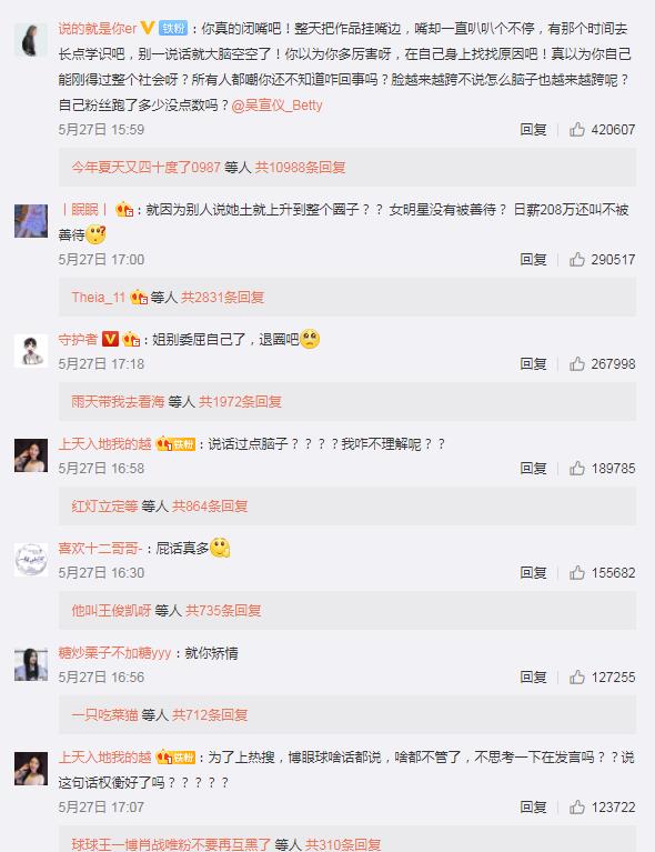 ![]() 下面是网友的一些负面评论,大有一种“恨铁不成钢”的感觉 ![]() 正如网友说的,她一开始是一把好牌,先是加入宇宙少女,然后在《创造101》里面以第二名的好成绩出道,成为限定团火箭少女(已解散)组合成员,当年她所在组合的歌曲《MoMoMo》、《卡路里》更是达到了人人都能哼两句的火爆程度,而关于吴宣仪的话题也是持续不断,海南小富婆之类的梗更是遍地都是,但是近几年她的口碑有所下降,看5月27日发的微博下面的这些评论就知道目前的一种状态: ![]() 在吴宣仪出道的这些年,关于她的话题还有很多,比如“牙齿”和“学历”的问题,首先是学历,她是高中学历,考上了湖南师范大学已经被录取,但是没有去读;然后就是牙齿,但年参加《斗罗大陆》的拍摄,吴宣仪因为牙齿的问题被网友吐槽,嘴唇盖不住牙齿的让其整个人看起来怪怪的,非常出戏,下面是之前牙齿的状态: ![]() ![]() ![]() 下面是吴宣仪最新的照片,牙齿没那么夸张了 ![]() |