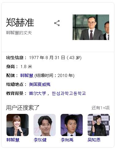 著名韩国老牌明星韩智慧经纪公司近日通告成,韩智慧已经顺利产下一个女婴,她曾经因为出现《夏日香气》《新娘18岁》被广大网友熟知。在2010年,她跟相恋仅仅3个月的韩国检察官老公郑赫准闪婚,在闪婚11年后怀孕产子。据悉,郑赫准是1977 年 8 月 31 日出生的,比1984年6月29日出生的韩智慧打了将近7岁。关于郑赫准的照片资料,在谷歌上找到一份: