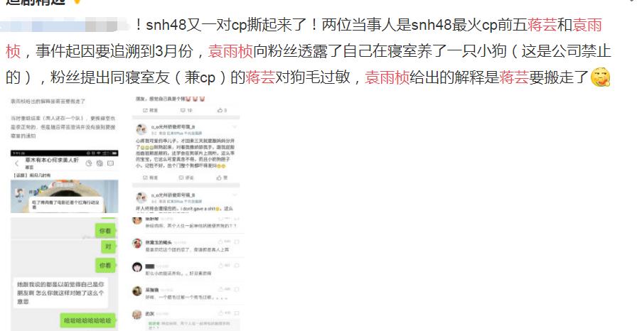 和袁雨桢相比,蒋芸的名气可能更小一些,毕竟袁雨桢的个性张扬,因此外界的评价也不高,而蒋芸的性格比较内敛,因此很多人对蒋芸并不了解,不过蒋芸和袁雨桢的关系不错,两人不但都是SNH48 Team SII成员,而且还是同一个寝室的室友,两人的芸雨cp,曾经也是snh48的大热cp之一,不过后来两人闹翻了,那么这是怎么回事? 2018年3月份,袁雨桢直播的时候说自己在寝室养了一条狗,公司是禁止在寝室养狗的,后来有粉丝提出她的室友蒋芸对狗毛过敏,袁雨桢回答说室友要搬走了,没想到后来蒋芸回复粉丝的时候称自己没有收到搬家的通知,没过多久,袁雨桢哭诉公司让自己把狗带走,说是因为有人告状,暗指是蒋芸做的,蒋芸随后就发文澄清,后来蒋芸有爆料称自己的东西被放在走廊上,经证实是袁雨桢做的。然后又有网友爆料,疑似袁雨桢的小号一直在辱骂责怪蒋芸,至此芸雨cp彻底be。 其实袁雨桢一直是很有争议的艺人,很多人都觉得她“可惜长了一张嘴”,有人喜欢她性格爽利,也有人觉得她卖耿直人设,袁雨桢日常状态和舞台上的她判若两人,就像精分成两个人一样,因此她有个外号叫做余震,除了和她的名字雨桢发音一样外,还因为这个外号是袁雨桢自称的,甚至玩梗说余震和袁雨桢是两个人。