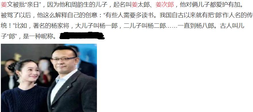 一说起什么太郎、次郎之类的名字,很多人的第一反应就是日本人,毕竟日本人的名字深入人心,而且重复率也是非常高的,非常具有民族特色,虽然说次郎之类的名字,并不是日本人的专属,但是中国人取一个“次郎”的名字,还是很容易引发争议的,尤其是一位名人的孩子。 姜文是娱乐圈公认的演技派,也是很有才华的导演,相信很多人都知道他那部《阳光灿烂的日子》,和刘晓庆、宁静等人传过绯闻,姜文现在的老婆叫做周韵,也是一位演员,曾经出演过姜文执导的电影《太阳照常升起》,在和周韵在一起前,姜文曾经有过一次婚姻,妻子是法国人,为她生有一女,后来因为聚少离多而离婚。 周韵和姜文是2005年在一起的,2006年生下大儿子,2008年生下小儿子,姜文的三个孩子名字都很特别,大女儿叫做姜一郎,大儿子叫做姜太郎,二儿子叫做姜次郎,很多人都吐槽姜文取得名字太“日本化”了。不过姜文解释说,古人也有叫“郎”的,比如说杨家将的杨五郎、杨六郎等,次郎就是第二个儿子的意思,也就是“二郎”。 不过对于姜文的解释,很多网友都不买账,觉得姜文起的名字确实不怎么样,如今姜次郎也已经长大了,2008年出生的话今年已经13岁了,不知道他现在对自己的名字是何感想,其实名字也只是个代号,网友们也大可不必上纲上线,名字一般都是寄托着长辈对晚辈的祝福,所以外人是没有资格指手画脚的。