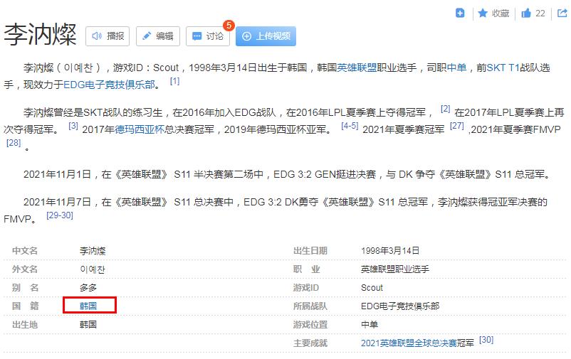 scout,著名EDG中单选手,原名李纳璨,1998年3月14日出生于韩国马山,是一名韩国外援,他的中文在外援当中算是最流利的,而且说的还是武汉普通话。目前网络上流传着scout已经加入中国国籍的说法,还说他的爷爷是武汉人,还说他来中国半年就入中国籍了,身份证都有了。不过根据2021年12月21日,最新的百度百科资料来看,他的国籍仍然是韩国的。