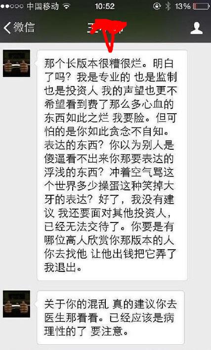 ![]() 《大象席地而坐》是一部长达四个小时的影片,王小帅是投资人,网传投90万,后来砍成75万,拍摄期间干扰胡波拍摄,对于《大象席地而坐》的长版本很不满意,下面据传是王小帅对该部影片的评价: ![]() 对于这个事件,@娱理,也采访过王小帅,下面是具体的内容: