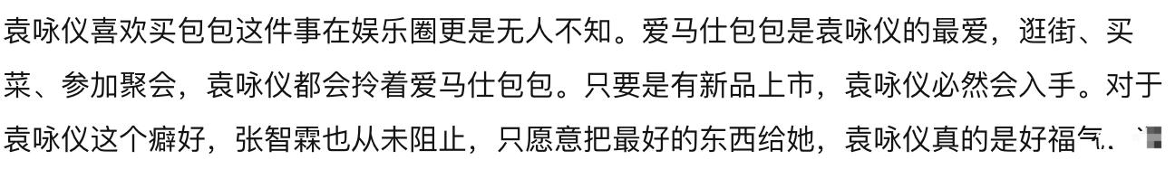 以前香港影视剧的女明星,都是很有“故事”的,尤其是一些长相比较漂亮的女艺人,更是容易被香港黑社会威胁,所以当时的女明星都希望能够嫁入豪门,但也有些女明星,脾气一直很大,比如说袁咏仪,就曾被爆过耍大牌。 坊间有传闻说,袁咏仪在和成龙拍戏的时候,两人发生了矛盾,据说成龙在电影拍完后直接下了“封杀令”,虽然不知道是真是假,但袁咏仪确实在这之后资源大幅度下滑,很长时间都没有恢复过来,其实这种直性子的人,在娱乐圈真的挺难生存的,但袁咏仪比较幸运的是,她的家庭条件很不错。 袁咏仪自己都说过,曾经在圈子里得罪过不少人,不过她会在别人发火前,就说“自己家里有九个警察”,因此很多人都不敢惹她,这句话来自于《康熙来了》这档节目,袁咏仪在节目中说出来后,引来网友的热议,可能是出生于警察世家的缘故,袁咏仪的性格一直是大大咧咧的,但也因此收获了爱情和友情,她的老公张智霖,也是非常有名的明星,两人的感情一直是让人艳羡的,那么袁咏仪买包是什么梗? 对袁咏仪和张智霖这两口子稍微有了解的人都知道,袁咏仪喜欢包包是出了名的,看见包眼睛就会发光,而张智霖也不止一次的吐槽过老婆喜欢买包,其实很多女性朋友都是喜欢包包的,这只是袁咏仪的个人爱好,就像有人喜欢豪车一样,包包对袁咏仪来说就是精神食粮,以他们的收入来说,这只能算是很平常的一个爱好。