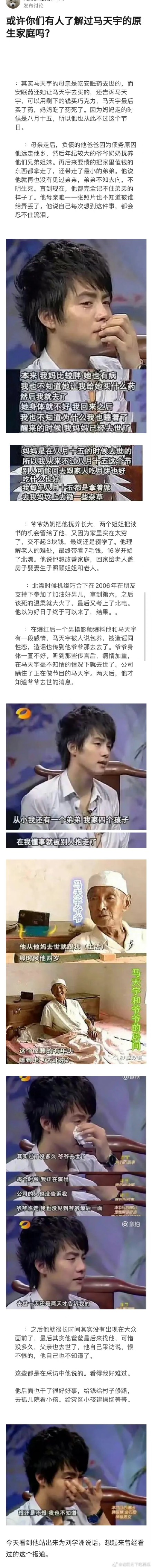 在刘学州事件之后,马天宇为其发声。知道马天宇的都知道,他的身世其实也很不幸,小时候母亲去世,父亲欠债。他小时候的故事可以写成一本小说了!小的时候家里条件很不好,他五岁,八月十五那一天,一直生病的妈妈让他帮忙买药,妈妈吃完药,不知道为什么他也睡着了,直到第二天邻居来敲门送月饼,才发现妈妈的身体已经冰冷,后来他猜测大概是妈妈自杀的药;妈妈死后,爸爸欠了一屁股债跑了,有一天好多人来家里抢东西,搬家具,把他弟弟也抱走了,那是见弟弟的最后一面,再也没找到。刚到北京的时候,兜里只有七毛钱,包吃住的餐馆打工,七毛钱过了一个月。火了以后一个叫高波的摄影师编造他是mb在北京被人包养谣言,结果被人告诉他爷爷,从小相依为命,对他最好的爷爷,气得病情加重,去世了。爷爷走那天公司为了让他参加节目瞒着他,结果没见到爷爷最后一面。赶回家的时候,姑姑告诉他爷爷走之前特别想他,特别想见他。