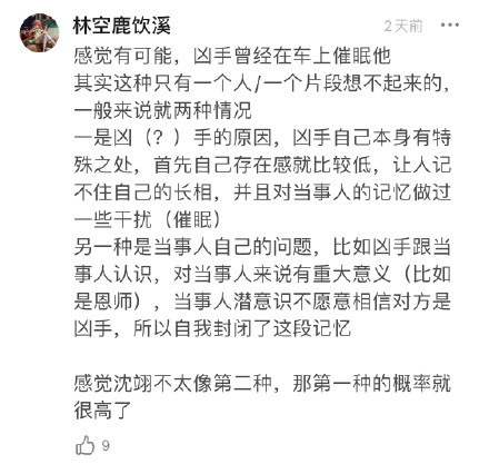 ![]() 大家都知道,沈翊一上车就睡觉,在热搜上还被网友调侃为“睡美人”,其实这是不是就是一个伏笔?沈翊坐车就睡觉是不是因为被催眠过?所以或许沈翊每次去案发现场都选择骑自行车,而不是打车是一个伏笔?很多人猜测沈翊画不出那个女人的脸是因为心理障碍,可是当年杜城让沈翊画那个女人的时候,还没有告诉沈翊他的画害死了那个警察的事吧?这么说的话,感觉催眠是最合理的解释了…