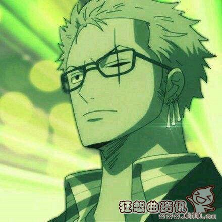 海贼王中的剑客罗罗诺亚·索隆,帽海贼团副船长、剑士,绿色头发,左耳戴三只黄色露珠耳环,绿色的肚兜 ,腰带上佩三把刀。