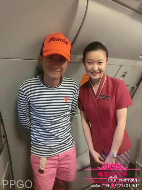 “好声音”金志文与大眼空姐合影,很配合地露出同样的笑容。